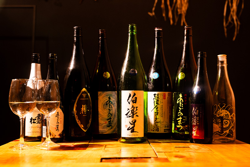 ワイングラスで提供する日本酒は50種類以上常備しており、伯楽星を醸す新澤醸造店や東北のお酒をメインに、蔵元の珍しい銘柄や初心者でも飲みやすいものからしっかりした味わいのものまで幅広いラインナップ!