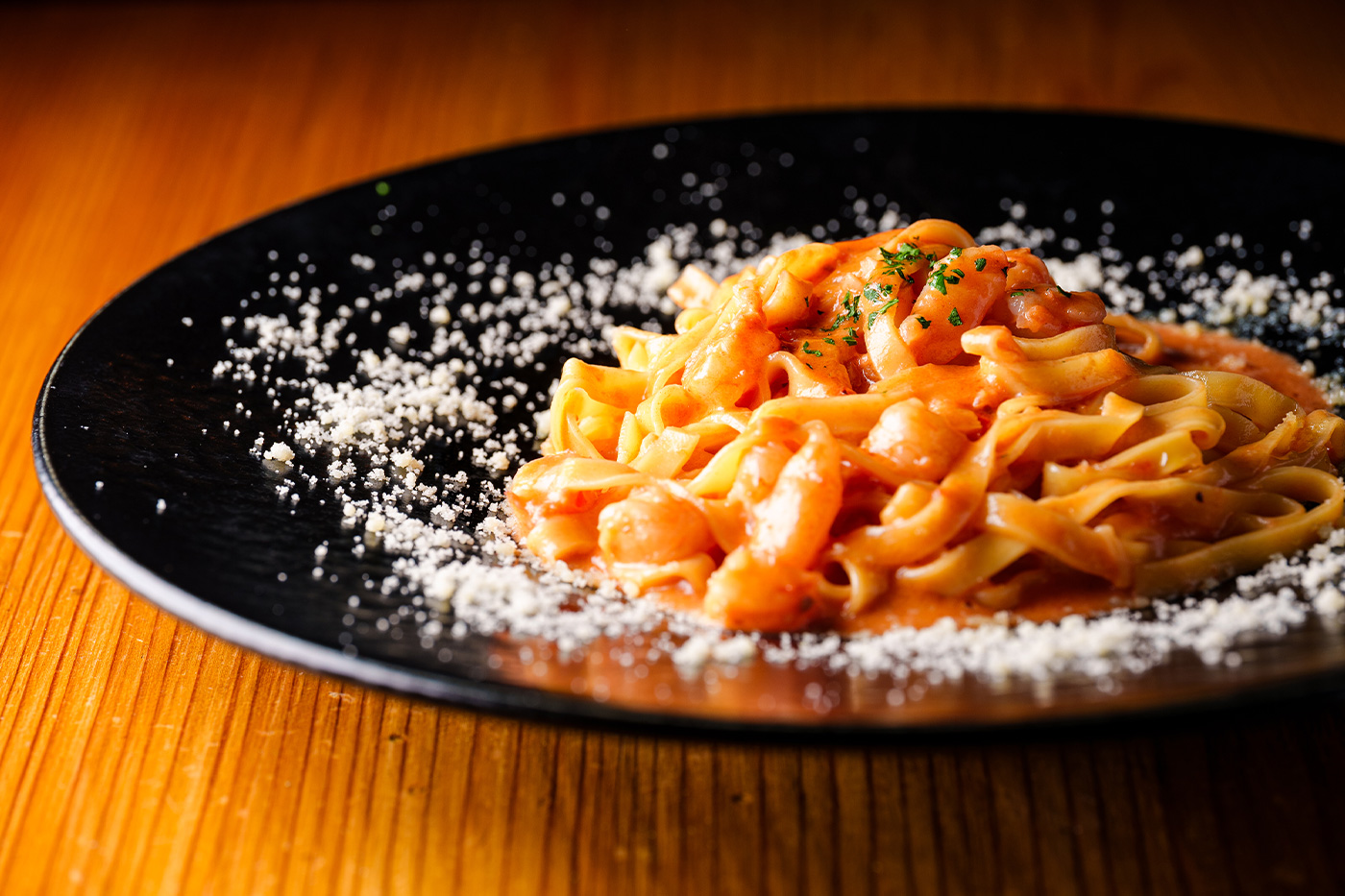 もちもち食感の生パスタや、プリプリ海老の濃縮ソース、店長気まぐれパスタ(オイル、トマト、クリーム系から選択可能)、カルボナーラなど豊富な品揃え。