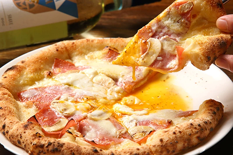 自慢の窯焼きピッツァは、生地をオーダーごとに伸ばし450℃の高温で一気に焼き上げる名物料理。